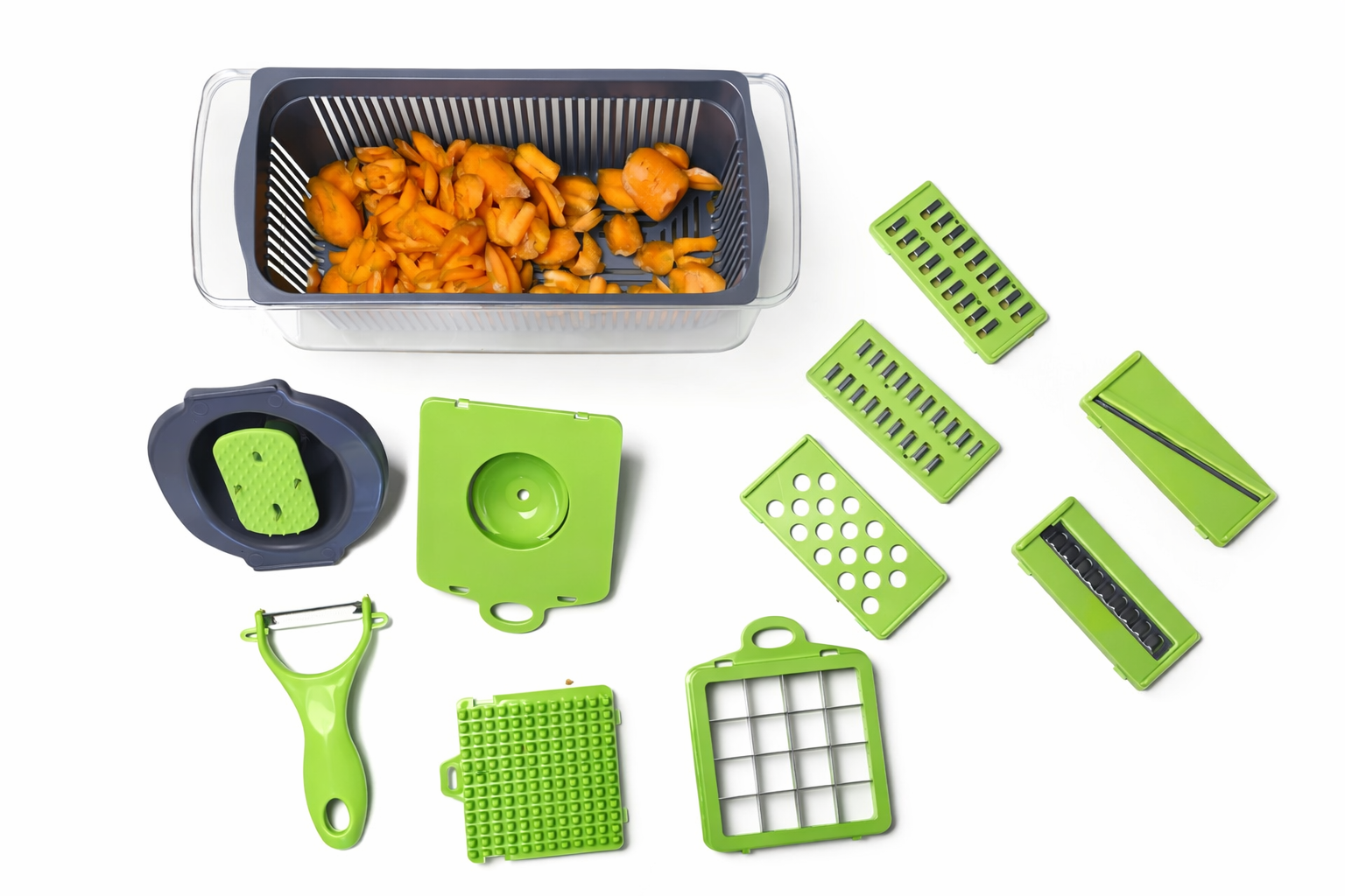 Maak een einde aan urenlang snijwerk met onze 16 in 1 multifunctionele snijder. Dit innovatieve apparaat is ontworpen om groenten, fruit en meer moeiteloos en snel te snijden, hakken en raspen. Met verschillende opzetstukken en een compact design is het de ultieme keukenhulp die je tijd en energie bespaart. Een must-have voor elke ChefExpress-keuken!
